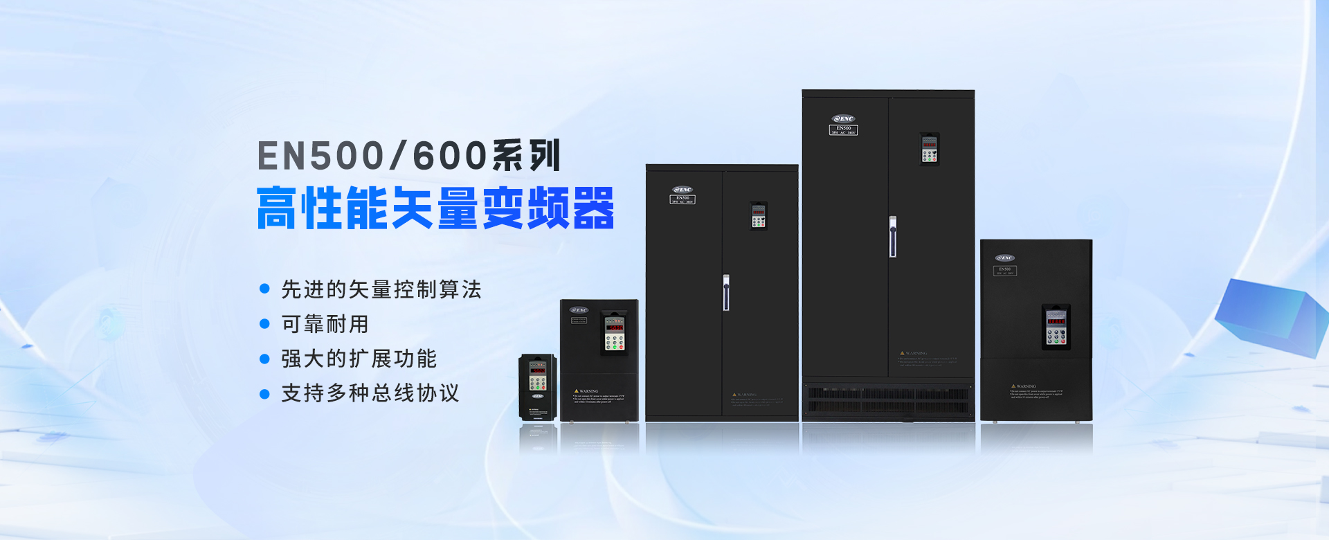 EN500/EN600系列高性能磁通矢量變頻器采用先進(jìn)的控制方式實(shí)現(xiàn)了高轉(zhuǎn)矩、高精度、寬調(diào)速驅(qū)動(dòng),可實(shí)現(xiàn)有PG矢量控制,無(wú)PG矢量控制,具有速度矢量和轉(zhuǎn)矩矢量?jī)煞N工作方式,能快速限住沖擊電流,廣泛用于高端制造業(yè)。該系列產(chǎn)品控制精度高、速度響應(yīng)快、低頻特性優(yōu)越,智能檢測(cè)與保護(hù)完善,豐富的外圍總線擴(kuò)展、端子擴(kuò)展、繼電器擴(kuò)展、模擬量擴(kuò)展等。